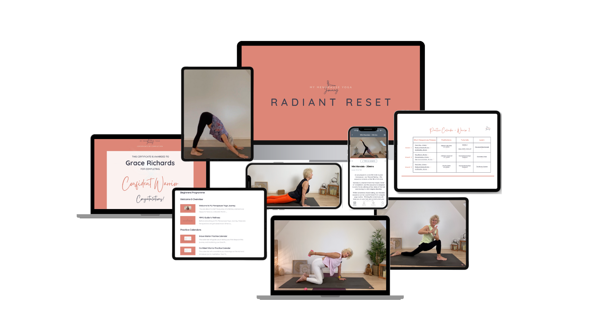 No more searching for the right content. Join our online studio and follow our unique Radiant Reset Programme where everything is all worked out for you. Enjoy structured calendars, progress tracking, and classes designed to match your energy and schedule. All you have to do is roll out your mat and watch your symptoms fade.Â